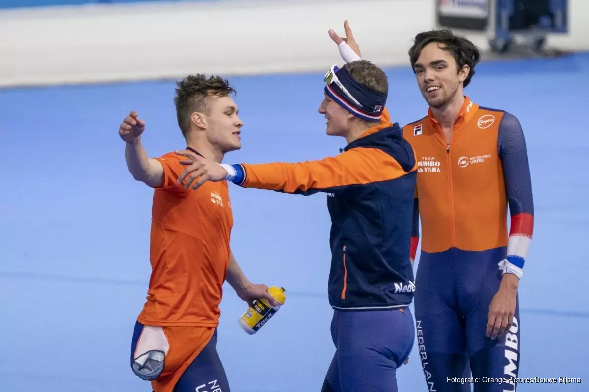 HEERENVEEN - Nadat er eerder op de dag al goud was voor de Oranje-vrouwen op de ploegenachtervolging hebben ook Patrick Roest, Marcel Bosker en Beau Snellink op de WK-afstanden gezegevierd. In Thialf won het Nederlandse trio in een rechtstreeks duel van Canada dat het zilver pakte.